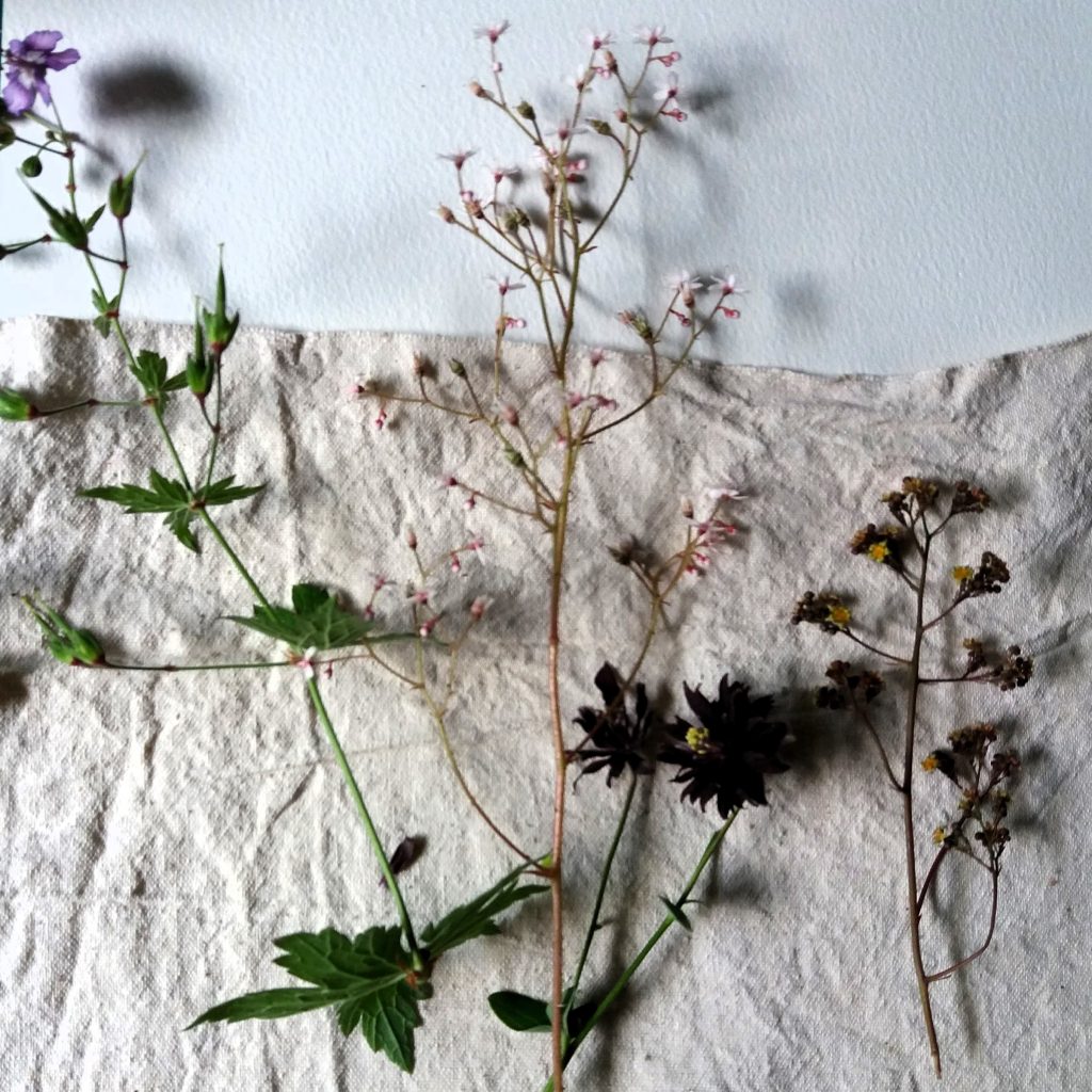 I began with wild flowers, long elegant stems that quickly filled metres of fabric with spare precise prints: Wild Sorrels, Cow parsleys, Wild Geraniums, Bedstraws and other (for me at the time) nameless plants. I was lucky. The first summers were hot and long. The earth was parched and the days stretched endlessly. Then I experimented with everything that was in the garden and began to plant more (new seeds every year), until I knew instinctively how long each print would last and how the shades would shift as each pigment lived and lapsed on the fabric. I lived and learned Flowerghosts as I went, and that will always be its heart.